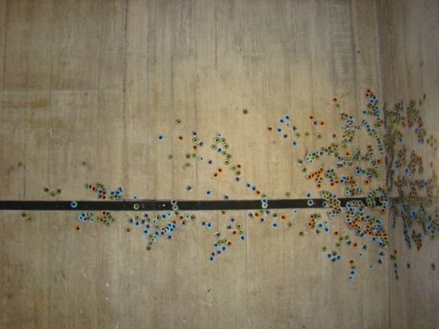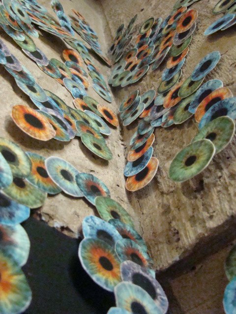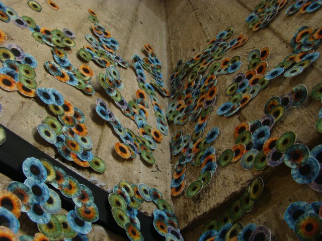 A installation artwork showing the eye movement and how a person expresses by their eyes without speaking. The eye movement has a wonderful and unique expressions which convey us from a feeling to another. Eye movements is a silent conversation, person may laugh or show anger by their eyes. In this artwork, the artist printed the human pupil in various colours and installed them on the wall displaying the movement of the eyes